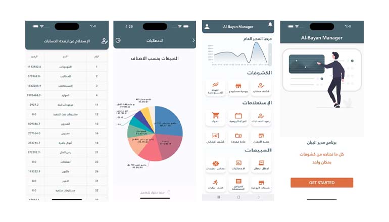 1-Graphic reports on sales, purchases, and cash balances for each branch individually or for all branches.